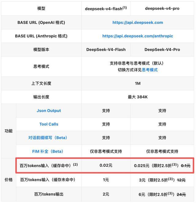 最新调价后,DeepSeek-V4-Flash每百万tokens输入(缓存命中)价格为0.02元,DeepSeek-V4-Pro为0.025元。