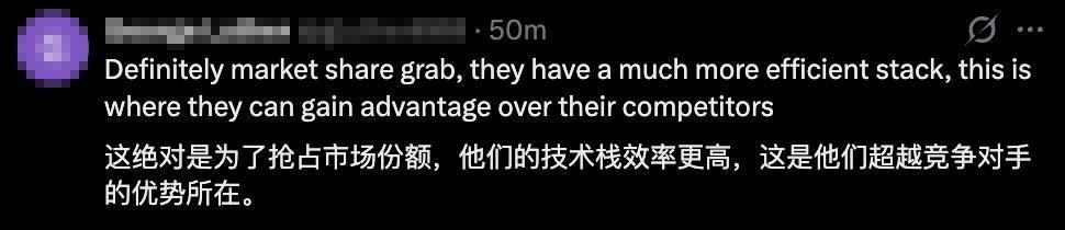 有网友在DeepSeek X账号的推文下猜测,这是DeepSeek在抢占市场份额,因为他们有技术优势。