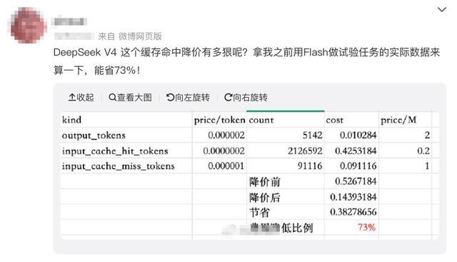 有微博用户结合自己的实际数据分析,DeepSeek此次降价折合能省73%。