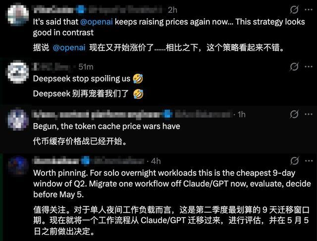有网友直言token缓存价格战已经开启、DeepSeek太宠我们了,现在是开发者评估将工作流程从Claude或者GPT迁移到DeepSeek的最佳窗口期。