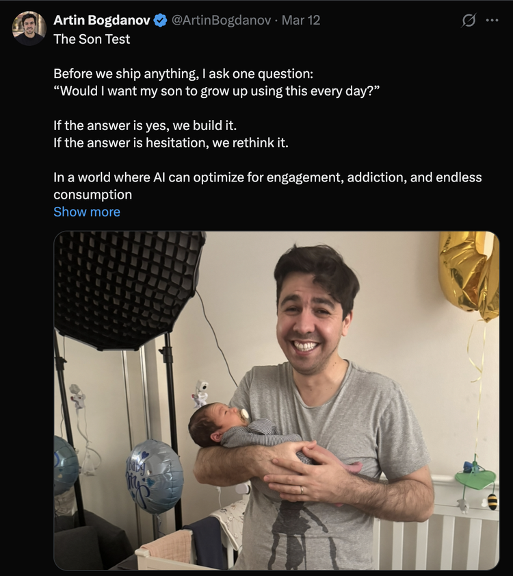 Artin还提到了他的"Son Test"。他有一个三个月大的儿子。自从当了父亲,他给产品加了一个新的KPI——一个极其二元的判断标准: