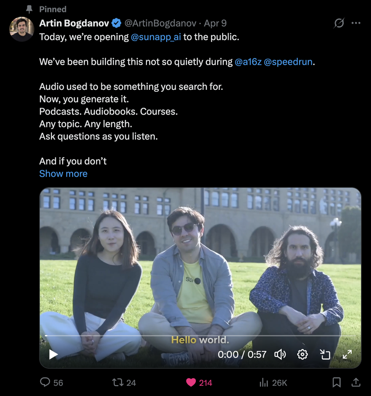 a16z Speedrun SR006里有60家公司,57%做B2B。只有一家做Audio。我们和它的创始人Artin聊了45分钟,发现它踩中的东西比看起来大得多。