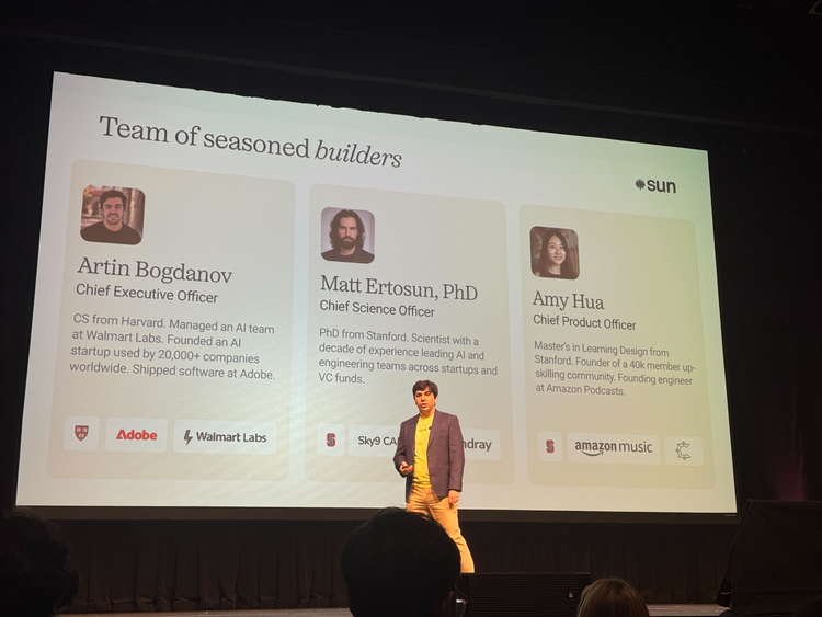 SUN的团队配置也值得单独看一下。Artin来自Walmart的AI预测系统,做过从下一小时到未来五年的全维度商业预测。Amy是Amazon Music播客的创始工程师,在大平台内部做了四年音频产品——她知道大平台为什么做不好这件事。Matt在Sky9 Capital做了两年多AI项目投资和孵化,看过大量类似的idea之后选择下场加入——一个VC选择跳到创业这边,通常意味着他看到了一个别人还没看到的东西。